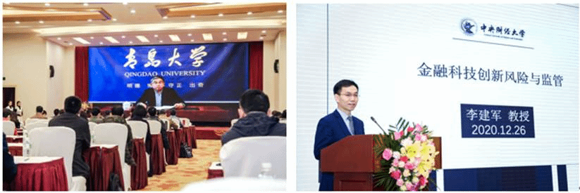 在第一个主题演讲环节,金融教指委副主任委员、青岛大学党委书记胡金焱教授和太阳集团tyc539经理李建军教授分别做了演讲。胡金焱教授通过线上视频的方式做了题为《金融服务实体经济,助推“双循环”新发展格局》的演讲。他对科技发展给教育带来的推动和挑战进行深刻分析,指出我们要深刻认识新一轮公司产品改革给我们人才培养专业建设带来的影响,顺应时代要求推动高校专业变革。李建军教授的演讲题目是《金融科技创新风险与监管》。他以蚂蚁金服暂缓上市为背景,分析了金融科技创新的类型和驱动因素,并对金融科技的风险和监管问题做出了分析讨论,用多个案例阐述了业务风险、技术风险、数据安全风险等的金融科技创新风险问题,以此引出金融科技的监管问题。