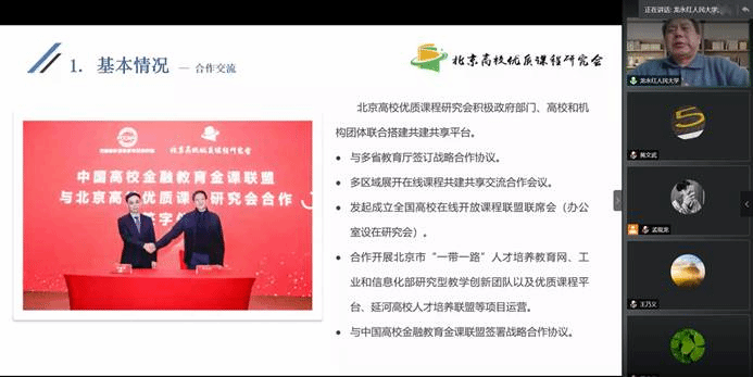 接着,北京高校优质课程研究会理事长、中国人民大学教务处处长龙永红作“紧密合作、优势互补、推进共建共享“的主旨发言。他介绍了北京高校优质课程研究会的成立背景、目标、组织结构、平台运行和工作推进情况,期待与中国高校金融教育金课联盟合作,推进更多优质课程的共建共享。