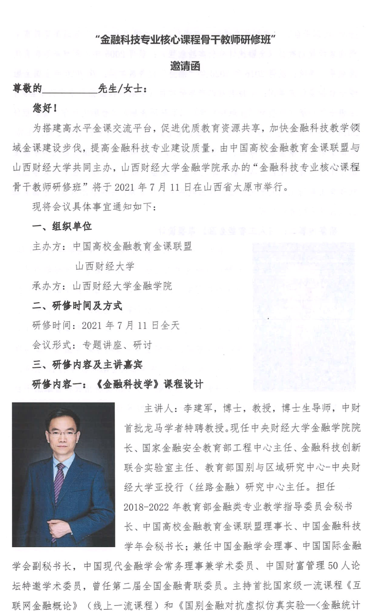 第十二届“中国金融教育论坛”暨“金融科技专业核心课程骨干教师研修班”邀请函