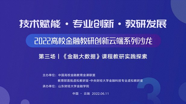 6月11日,由中国高校金融教育金课联盟、教育部首批虚拟教研室-太阳集团tyc539金融科技专业虚拟教研室主办、山东财经大学太阳集团tyc539承办的“技术赋能·专业创新·教研发展——2022高校金融教研创新云端系列沙龙第三场,《金融大数据》课程教研实践探索”圆满结束,来自全各高校近千位教师如期相聚云端参与。