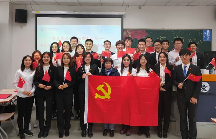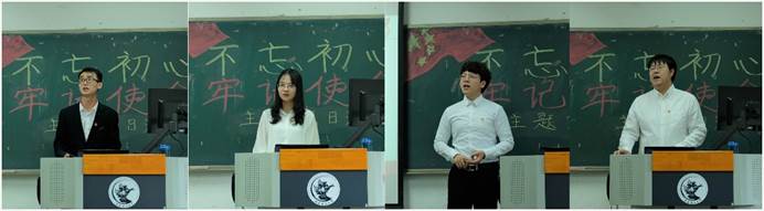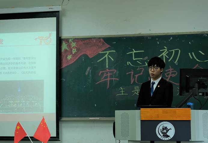 朱家雲等四位优秀党员代表也分别以初心、使命、征程为题发表看法和感悟。朱家雲同志以“不忘初心”为题,他认为初心不仅是情怀,更是使命和担当,中国共产党人始终将为人民谋幸福作为初心,在奋斗的路上砥砺前行;曹倩倩同志以“牢记使命”为题,讲述了她五年多里看到的中财师兄师姐奋斗在祖国经济建设第一线的鲜活事例,感受到的中财为党育人、为国育才的初心与使命;刘必辉同志以“奋进新征程”为题,他认为新中国70年来虽然取得了巨大进步,但发展过程中也存在不少问题和矛盾。他以成都的贫富差距问题为例,讲述了他希望能为成都消灭贫困、为祖国经济建设出一份力的抱负和理想;王晏如同志结合自己实际调研的经历,讲述了目前城乡发展不平衡的问题,他认为我们应当走出校园,实地考察和了解祖国的各个角落,这样自然就能发现各地区发展中遇到的问题,从而用自己的专业知识解决问题。