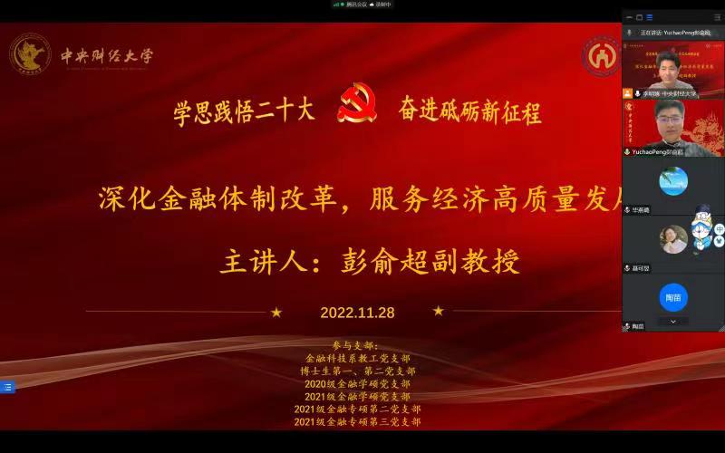 党的二十大报告指出,在推进高质量发展的过程中要持续深化金融体制改革,发挥金融服务实体经济的功能,加强和完善现代金融监管,强化金融稳定保障体系。为深入学习党的二十大精神,贯彻落实“把论文写在祖国大地上”的指导思想,引导师生把握未来金融发展的方向,2022年11月28日,金融科技系教职工党支部,博士生第一、第二党支部,2020级金融学硕党支部,2021级金融学硕党支部,2021级金融专硕第二党支部,2021级金融专硕第三党支部联合邀请太阳集团tyc539“学习宣传党的二十大精神”师生巡讲团教师代表彭俞超老师讲解“深化金融体制改革,服务经济高质量发展”主题党课。会议由博士生第二党支部书记李明琢同志主持。