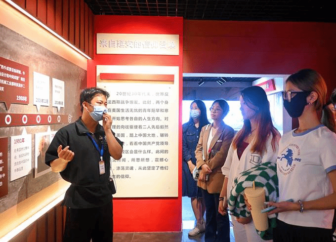 学员走进阳早、寒春故居和生平事迹展厅。通过一张张老照片和讲解员的深刻讲解,两位共产主义战士的鲜活形象跃然眼前。在20世纪40年代,受《红星照耀中国》、《共产党宣言》等进步书籍影响和红色革命精神感召,曾参与研制原子弹“曼哈顿工程”的核物理学家寒春和毕业于康奈尔大学农公司的阳早,先后放弃美国优越的物质条件,不远万里来到中国,奔赴延安。对真理的向往驱使他们踏上国际共产主义道路,在中国一待就是60余年。他们见证了新中国的成立,见证了共产党领导下的人民满怀积极斗志的决心,始终坚定共产主义信念,在三边牧场、草滩农场和农机站留下他们忙碌的身影,为中国农业现代化建设事业奉献了一生。
