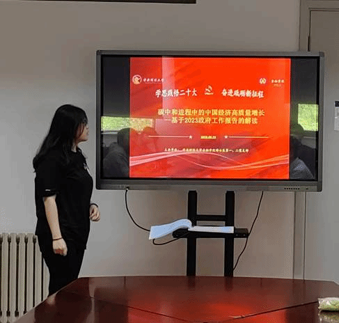 在学习心得体会分享环节。王彦一同志基于习近平总书记在学习贯彻习近平新时代中国特色社会主义思想主题教育工作会议上所发表重要讲话内容,从主题教育的重要意义和努力方向展开陈述与介绍。白茹雪同志注重参考了《经济研究》2022年12期的文章“碳中和背景下的中国经济低碳转型:特征事实与机制分析”,对我国目前碳中和的成绩与面临的挑战加以阐释。